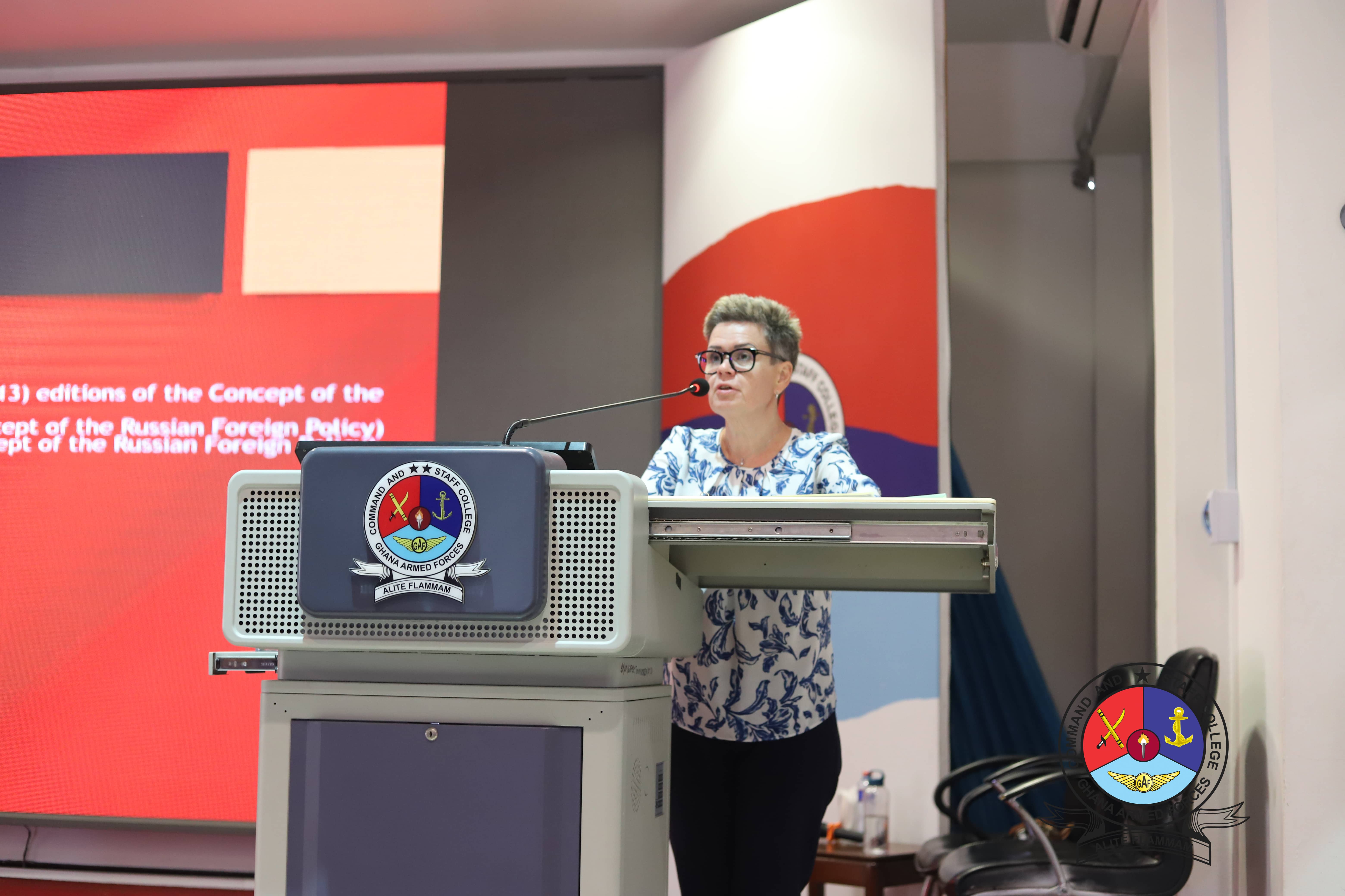 Later, the Russian Counsellor deliver a lecture to participants of Senior Command and Staff Course 47 on the topic "Russian Foreign Policy: Impact on Africa outlining areas such as Periodization of the Russian Foreign Policy, Russia-Africa Relations, Cooperation within UN and UNESCO and Why Russia and Africa need each other. The Commandant presented a plaque and a kente stole to the Russian Counsellor as a symbolic gesture from the College.